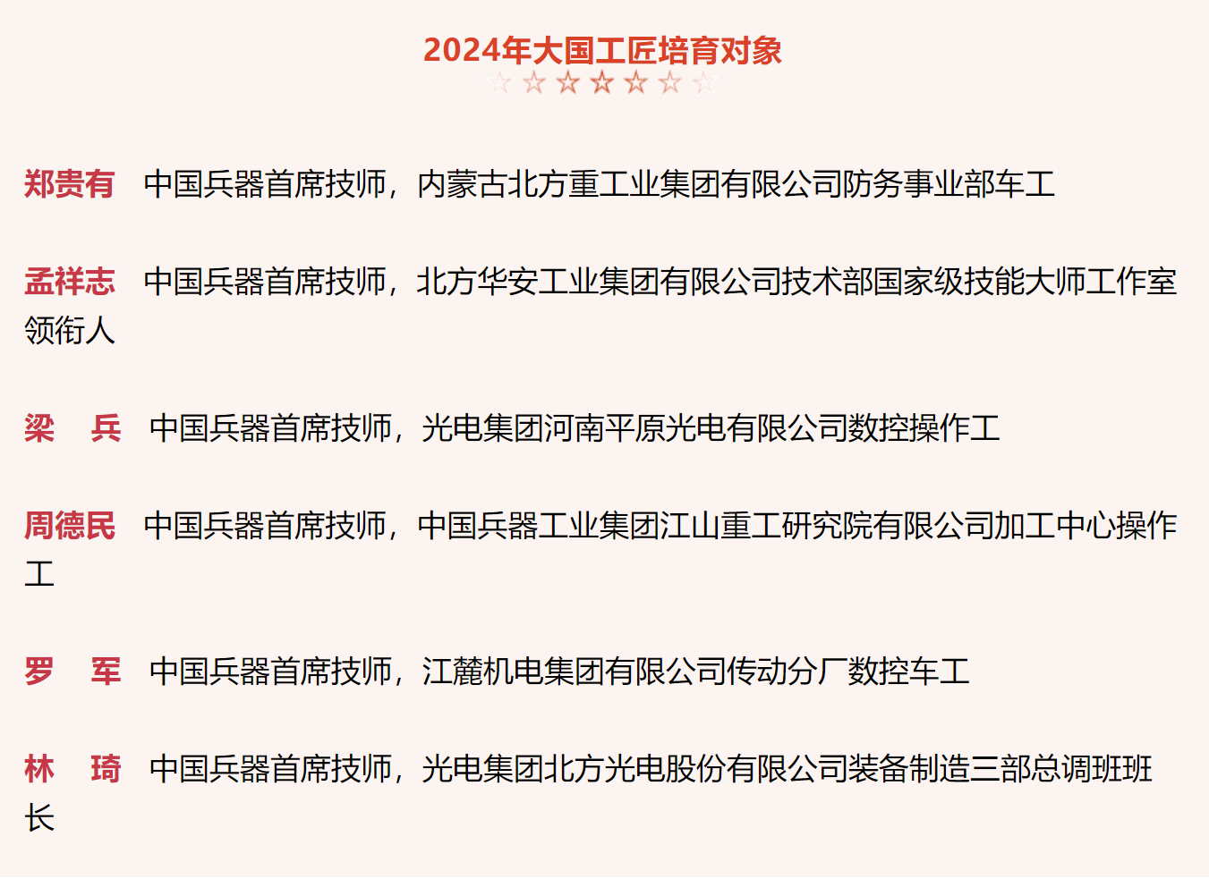 兵器工業(yè)集團(tuán)6名高技能人才入選2024年大國工匠培育對(duì)象名單 |